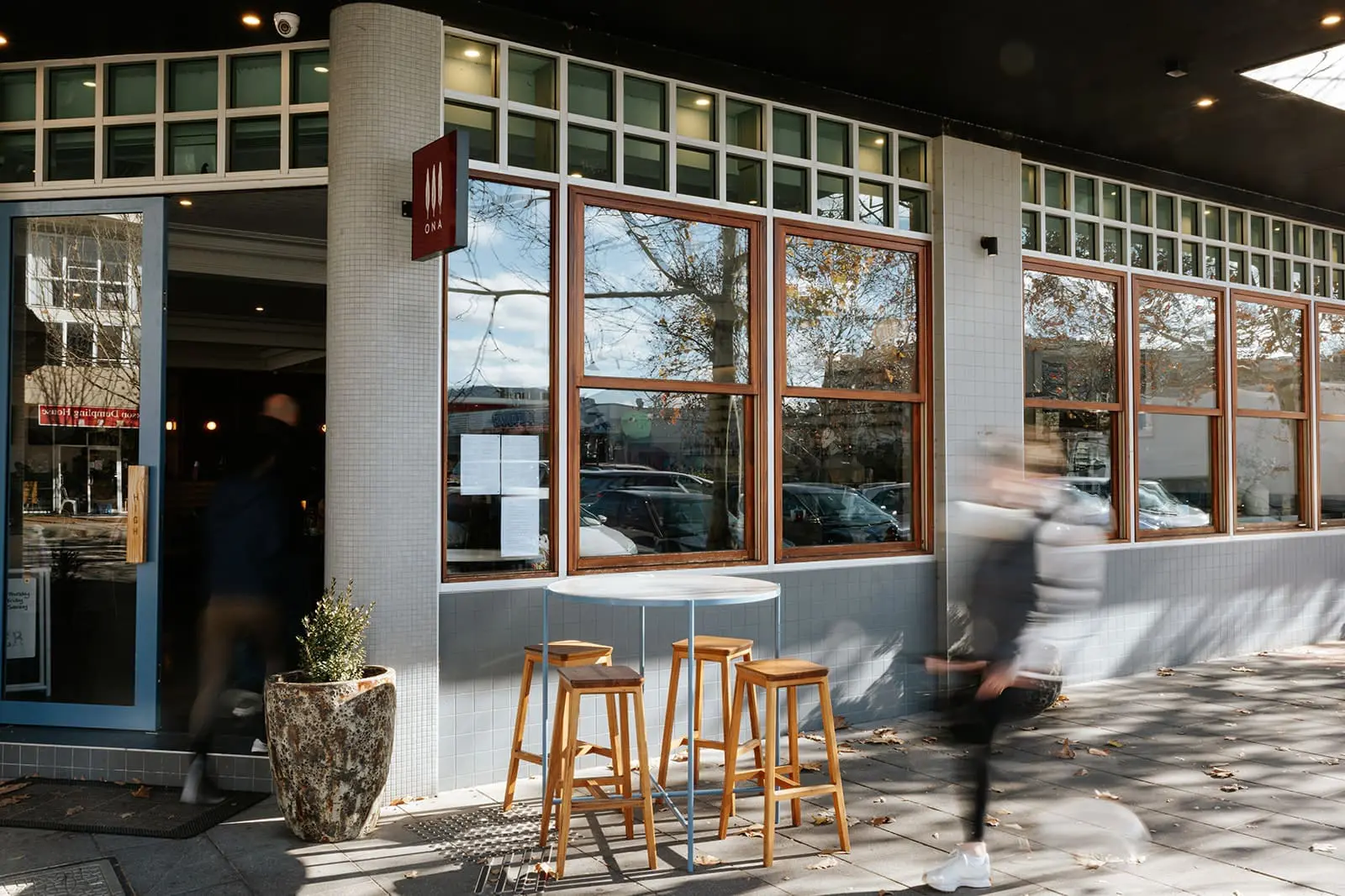 Light‑filled, airy interiors; varied seating (communal, booths, bar, outdoor); welcoming for meetings, families, solo time